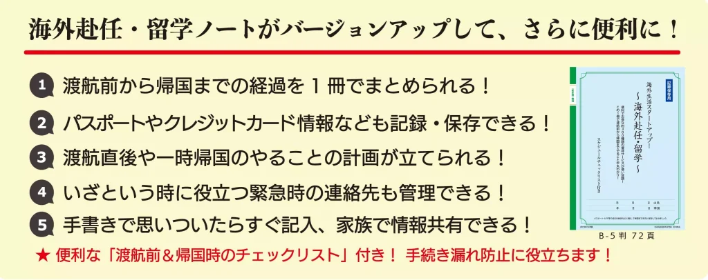 「海外赴任までのスケジュールチェックノート」一冊が、あなたの海外生活のスタートをスムーズにしてくれるはずです。